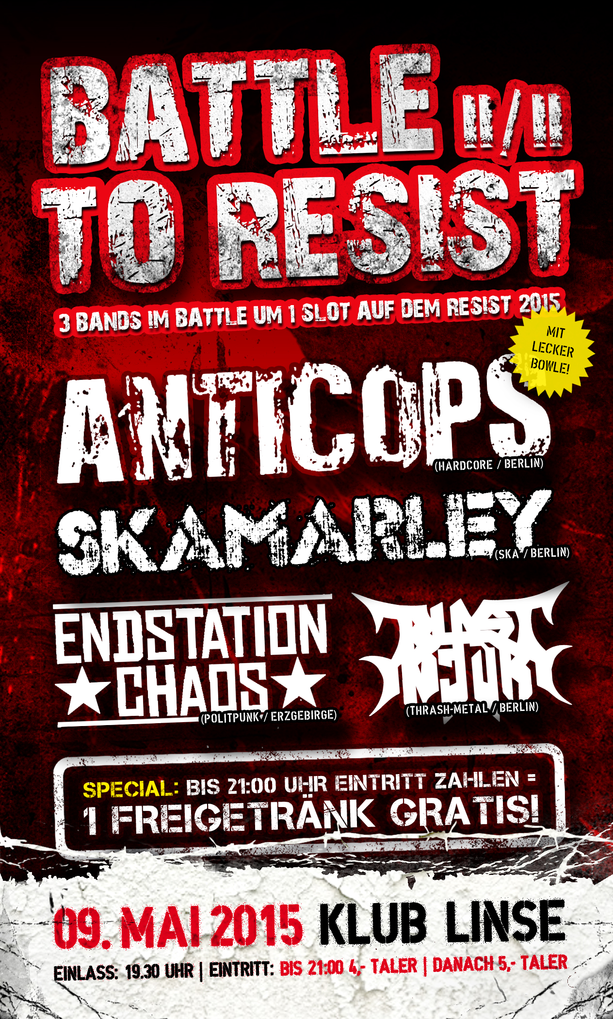 Am 09.05.2015 findet das 2. Battle To Resist statt! Der Gewinner des Battles tritt als Opener auf dem Resist To Exist Festival auf!